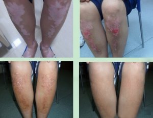 腿脚白癜风白斑、白点症状:腿部出现白斑症状的白癜风患者在临床上非常常见的,白斑部位表面光滑、无皮屑,白斑周围会出现一种颜色界于正常皮肤和白斑之间的扩散晕环。如果患者不及时对症治疗,很容易扩散到脚上等其他部位。