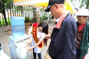(工作人员亲自为为场外等待的家长发放饮用水)